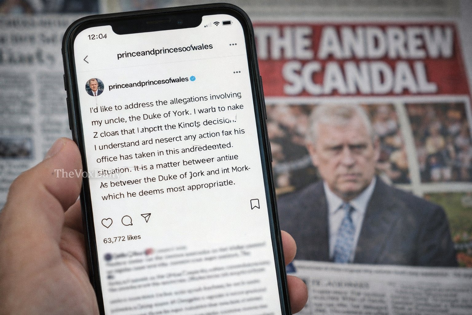 close-up of Prince William's official Instagram statement on a smartphone, with news of the Andrew scandal in the background.