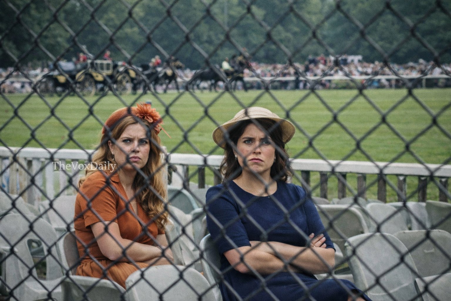 paparazzi shot of Princesses Beatrice and Eugenie sitting in the general public area of a horse race, excluded from the royal box.