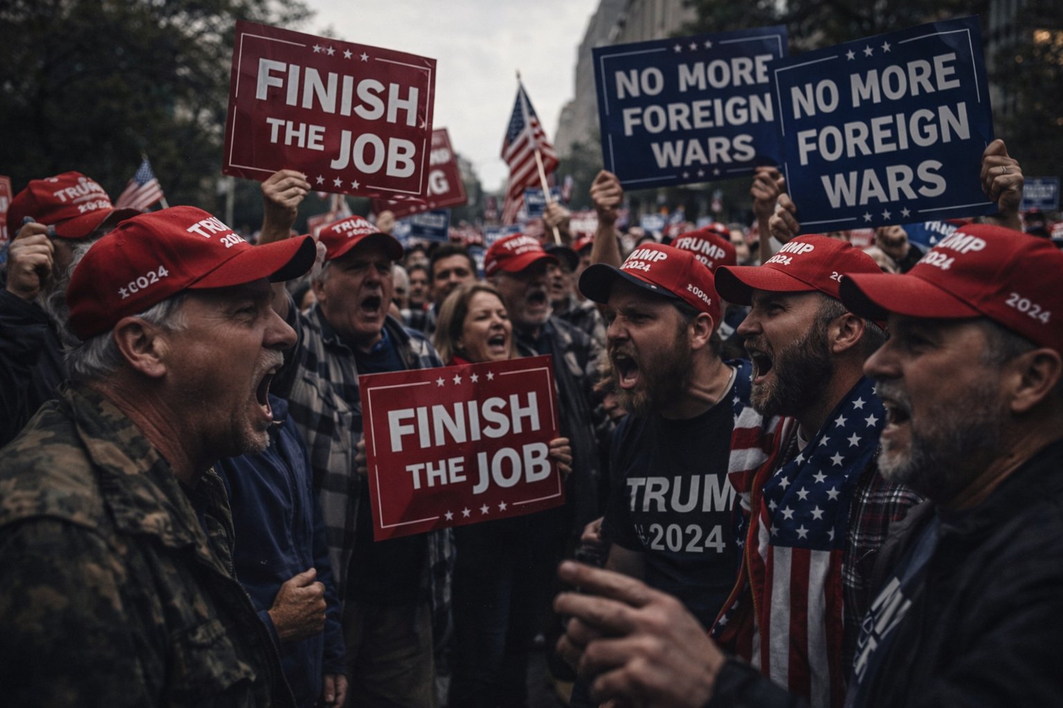 satirical image of Trump supporters divided on the streets of D.C. over the 2026 Iran war.